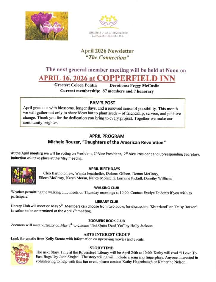 The Woman's Club of Royersford is a non-profit organization dedicated to serving the people of Royersford and the surrounding area. We offer social, educational, and community service opportunities enabling members to make a difference in the lives of others. Founded to support the Royersford Public Library, we continue to be committed to literacy and promoting the written word.