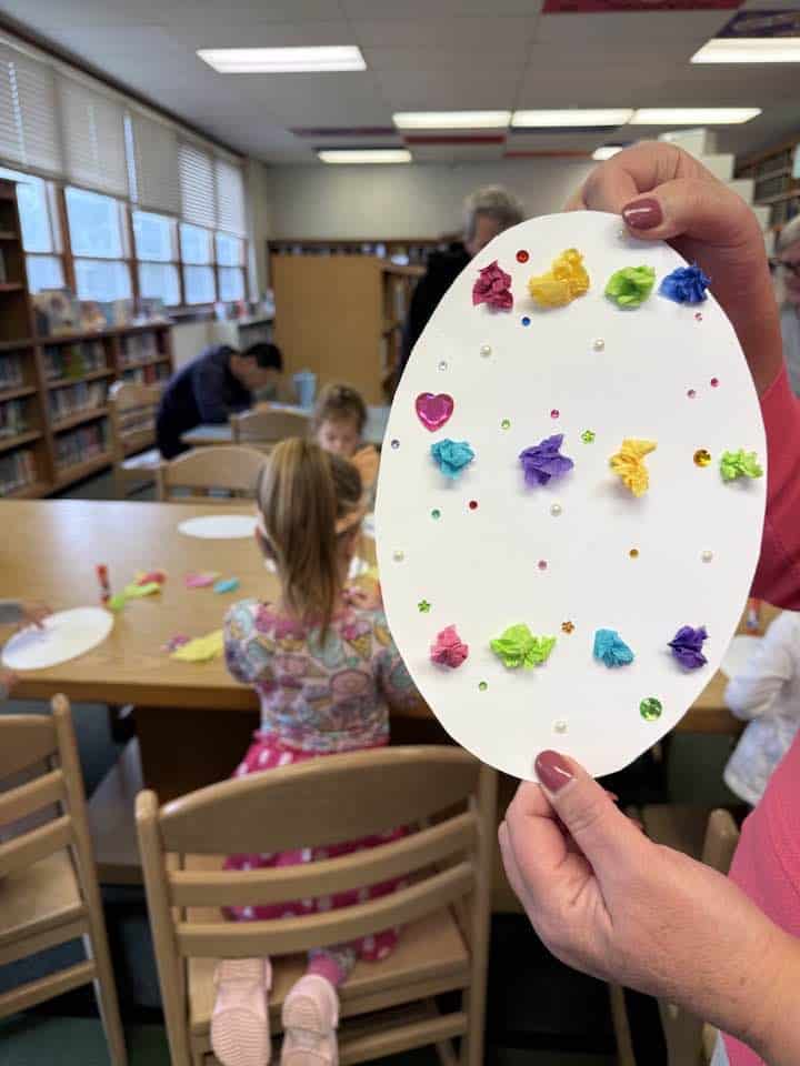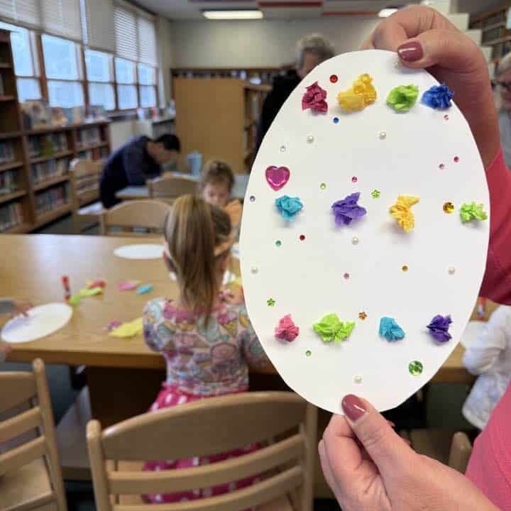 Following the story, the craft session complemented the book. Each child received materials to cut out an egg shape, which they then decorated using stickers, crinkled tissue paper, and crayons. This hands-on activity allowed the children to express their creativity while connecting with the story’s theme.